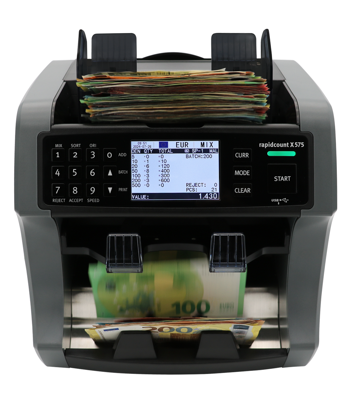 - Verdächtige, stark verschmutzte oder beschädigte Banknoten werden in das zusätzliche Rejectfach sortiert, sodass der Zählvorgang nicht unterbrochen wird