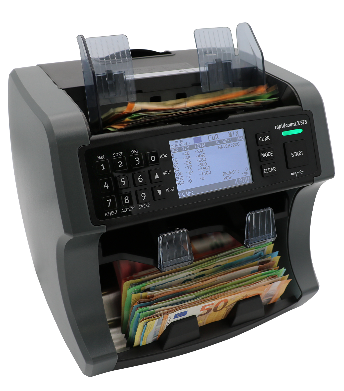 - Sortierung der Banknoten nach Sorte und nach Orientierung möglich