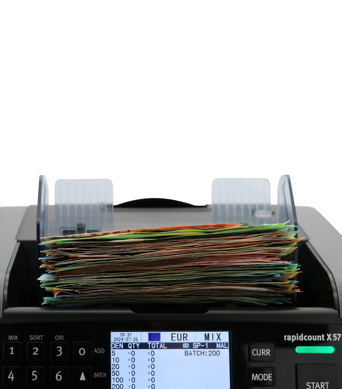 - Sortierung der Banknoten nach Sorte und nach Orientierung möglich