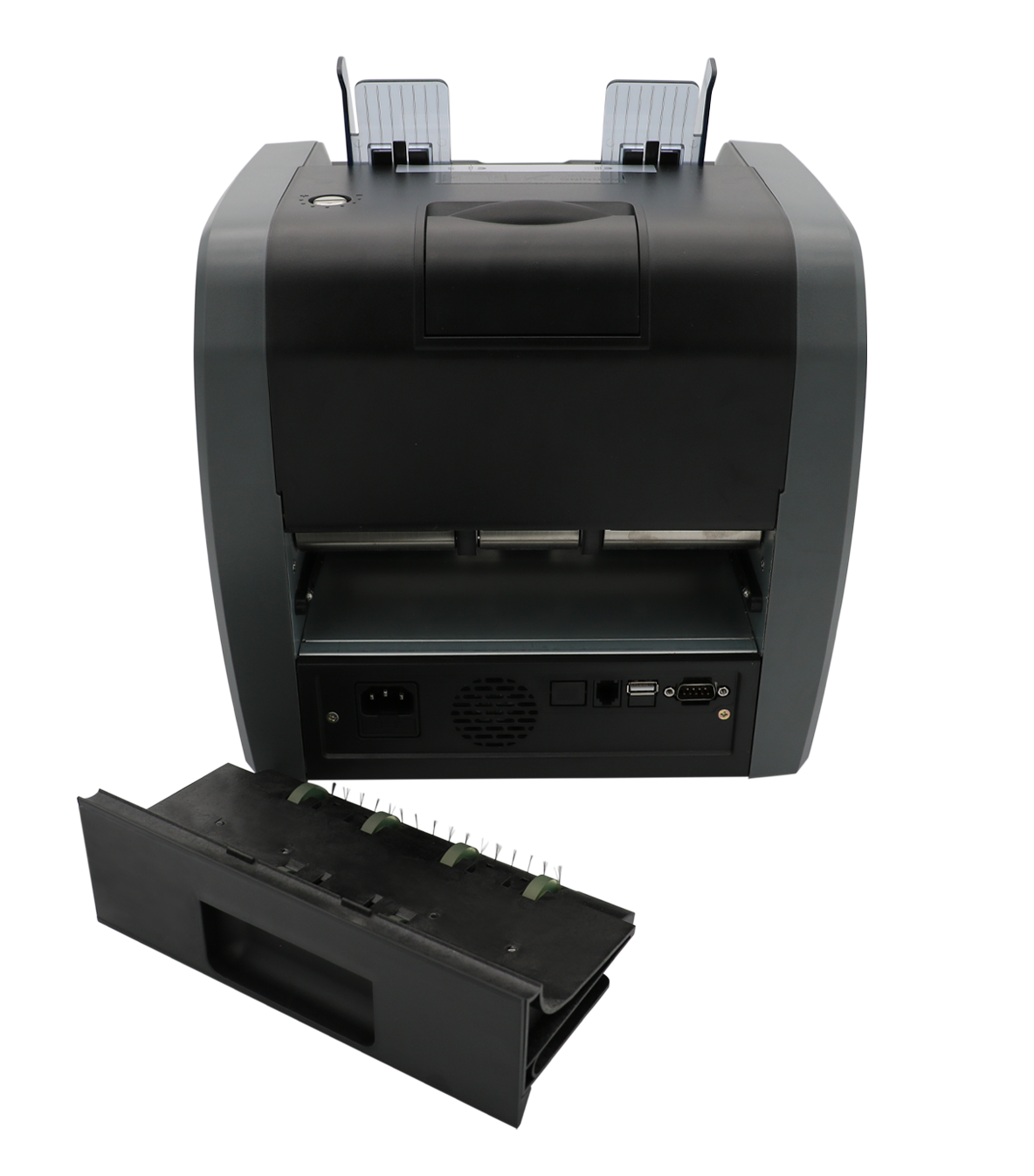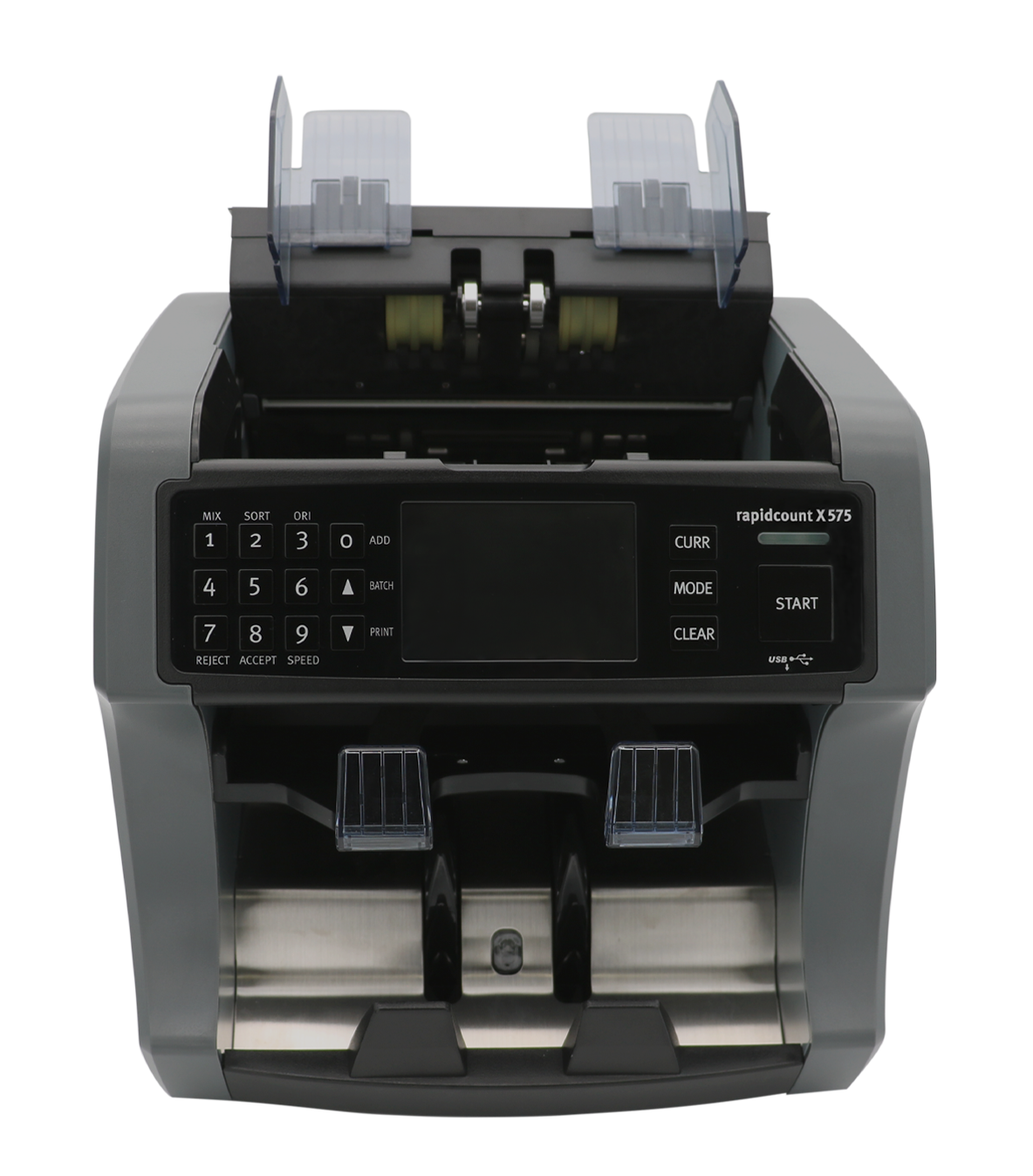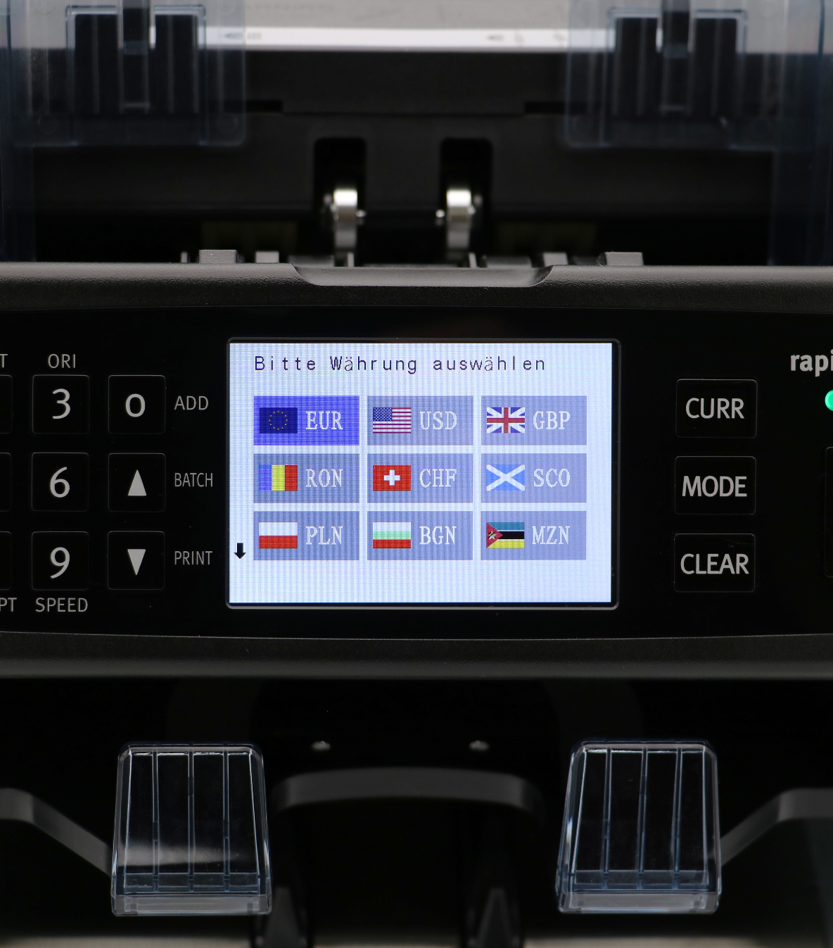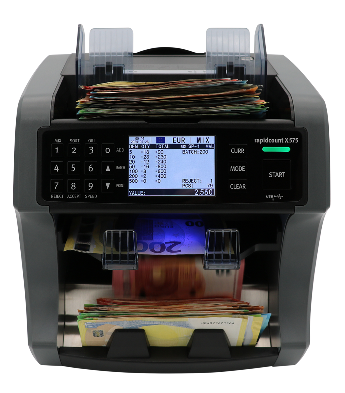 - Verdächtige, stark verschmutzte oder beschädigte Banknoten werden in das zusätzliche Rejectfach sortiert, sodass der Zählvorgang nicht unterbrochen wird